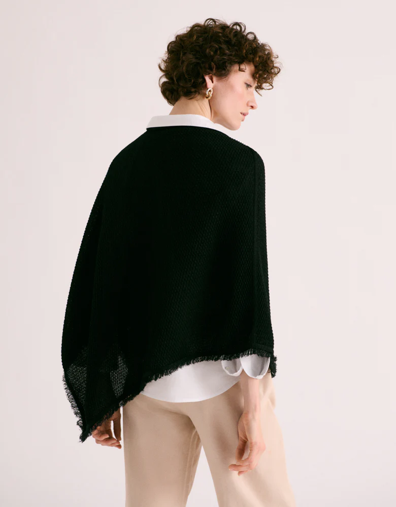 Versatile à souhait, cette cape se porte aussi bien sur un jean que sur une robe fluide.