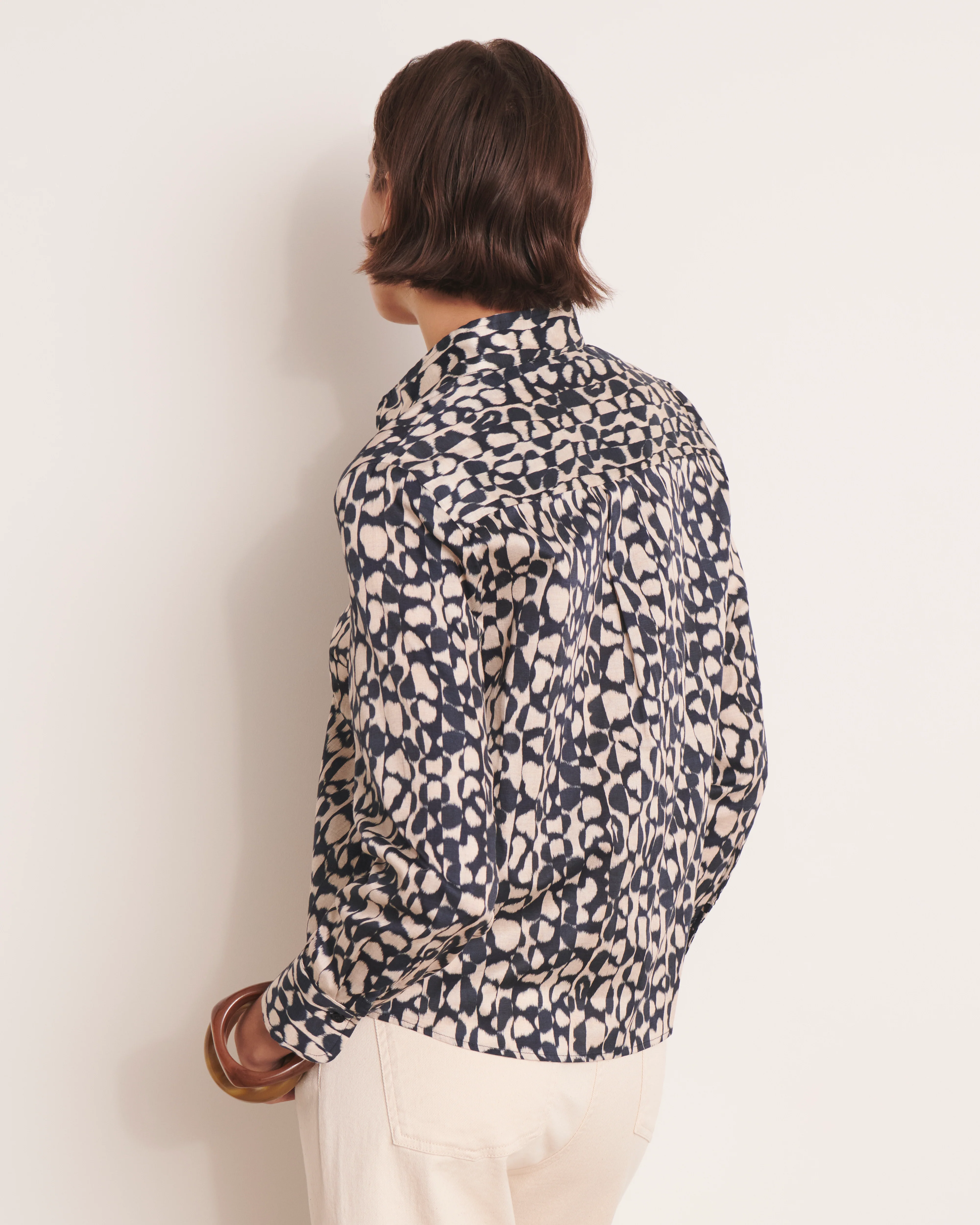 Élégance discrète et modernité subtile se rencontrent dans ce chemisier imprimé au motif abstrait bleu sur fond beige.