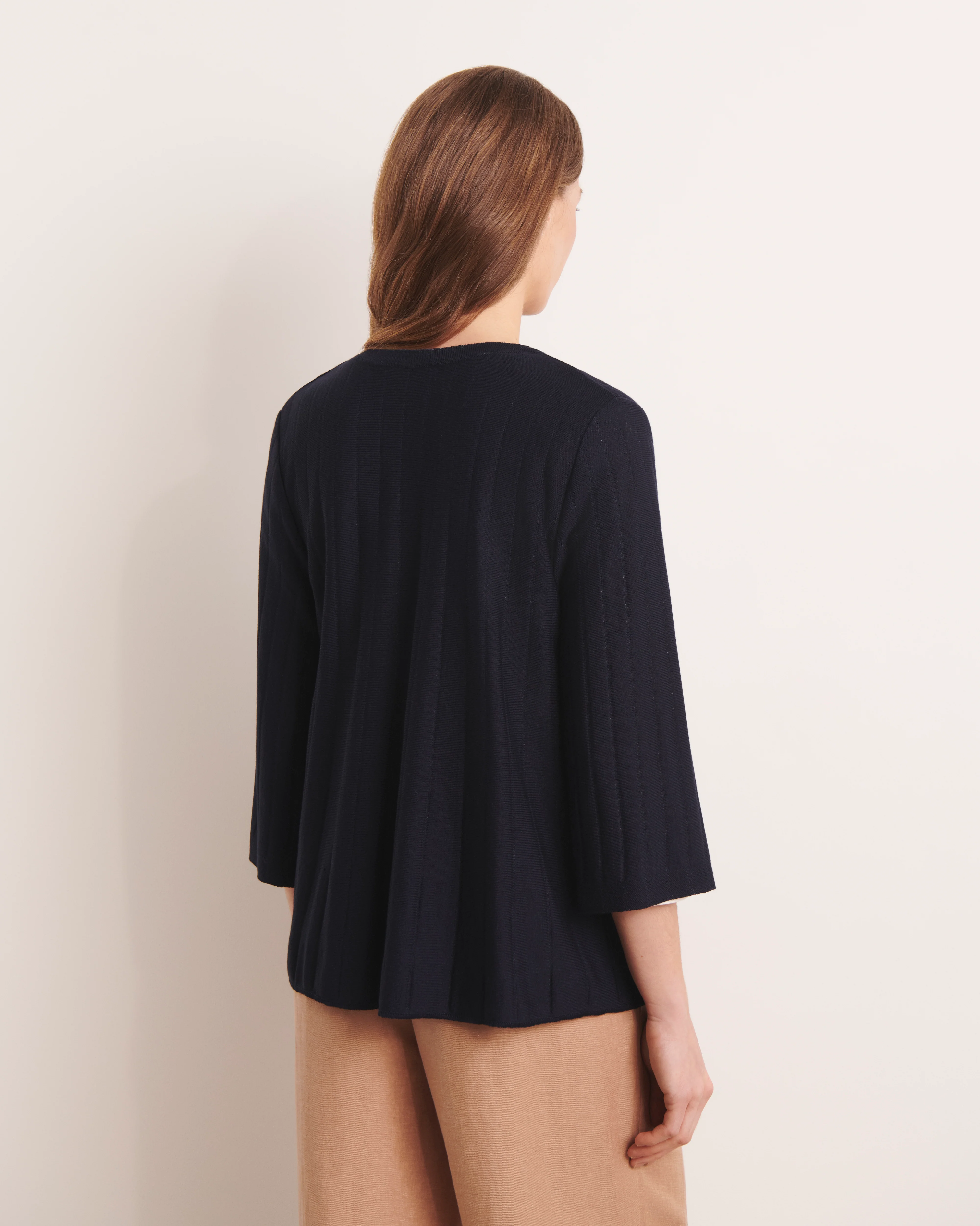 Sa coupe ouverte, sans boutonnage, structure la silhouette sans la contraindre, tandis que les manches 3/4 dégagent le poignet avec féminité.