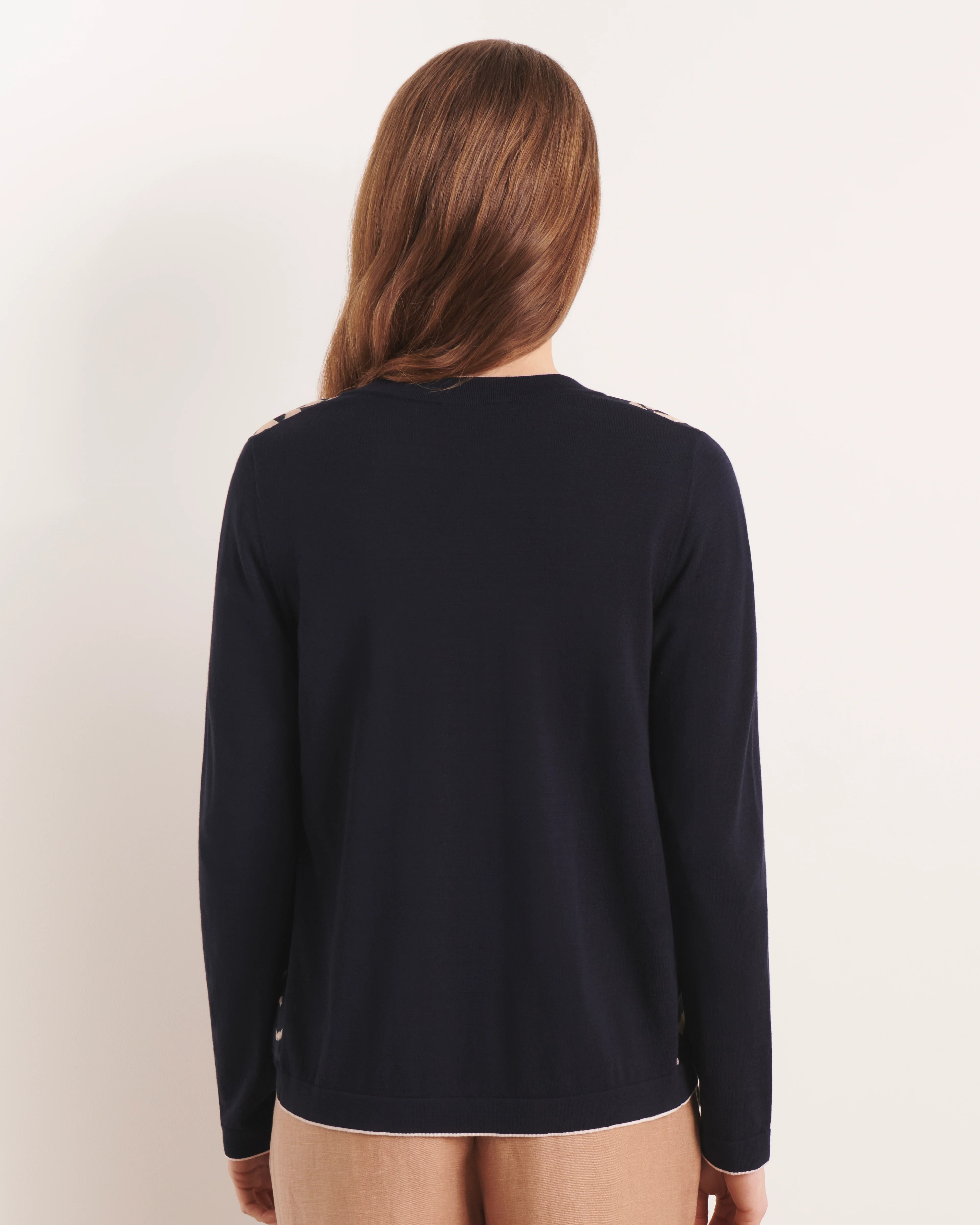 Les manches longues et l’encolure arrondie, soulignée par une bande remaillée, offrent une allure soignée tout en douceur.