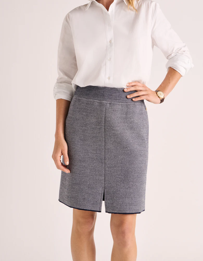 Notre jupe en maille incarne l'élégance moderne et le savoir-faire artisanal français. Conçue pour s'arrêter juste au-dessus du genou, cette pièce se distingue par sa simplicité raffinée et son confort inégalé. Une fente simple sur le devant ajoute une touche de sophistication discrète, tandis que sa maille douce et extensible assure un confort optimal tout au long de la journée.