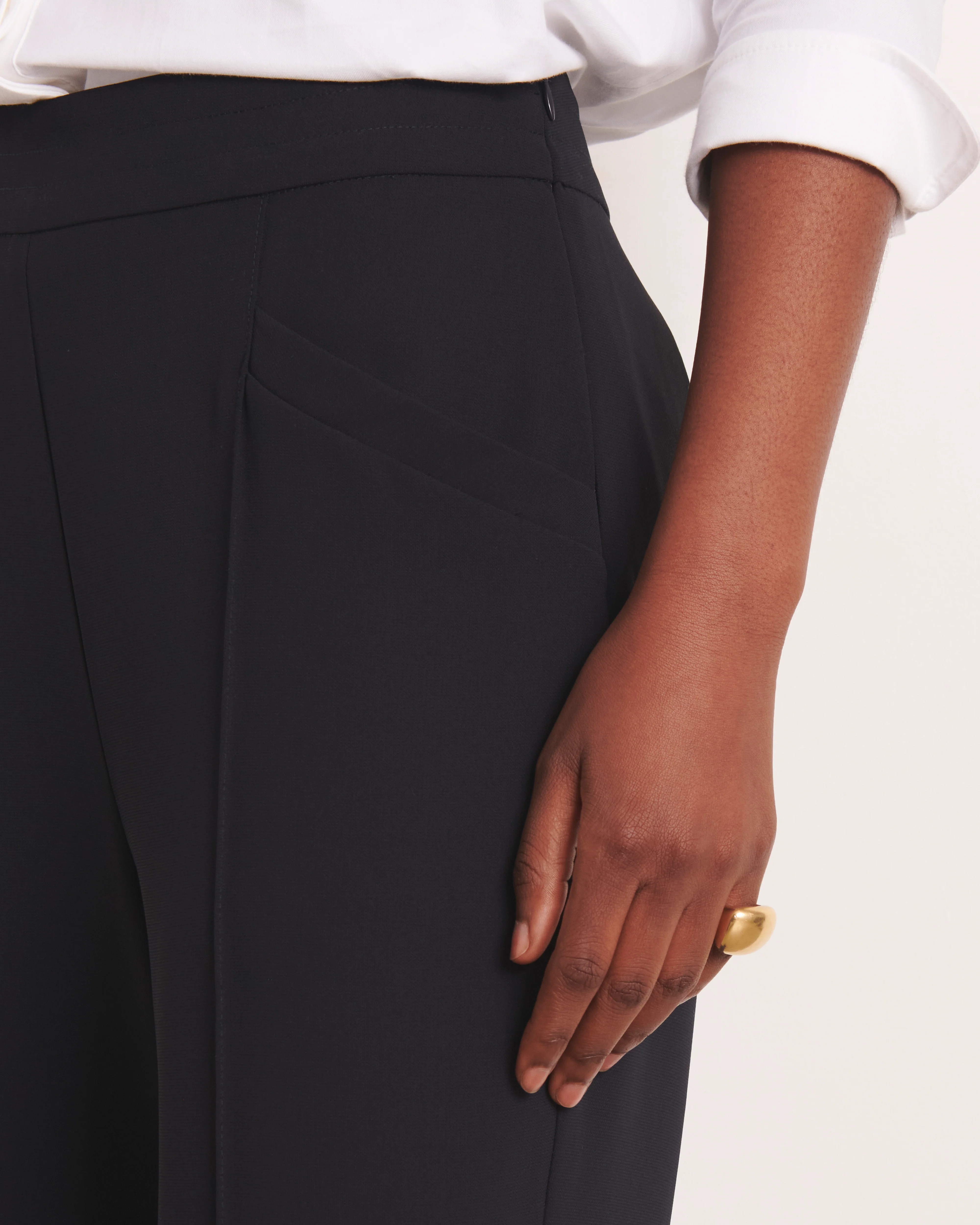 Les poches obliques au niveau du bassin sont discrètes et fonctionnelles, tandis que les pinces dans le dos apportent une finition soignée.