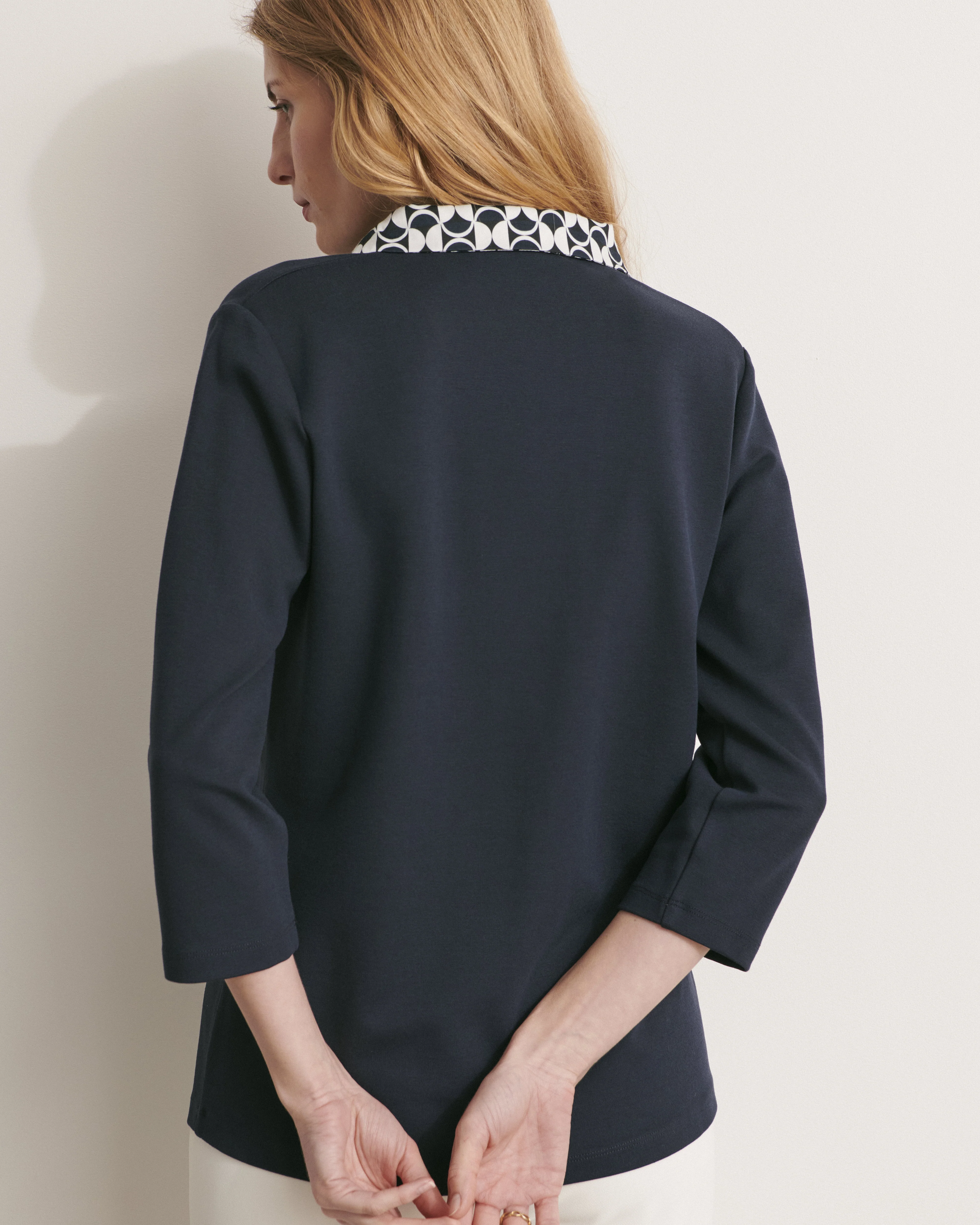 Son encolure avec col et patte à l'imprimé graphique bicolore apporte une touche moderne à ce classique intemporel.