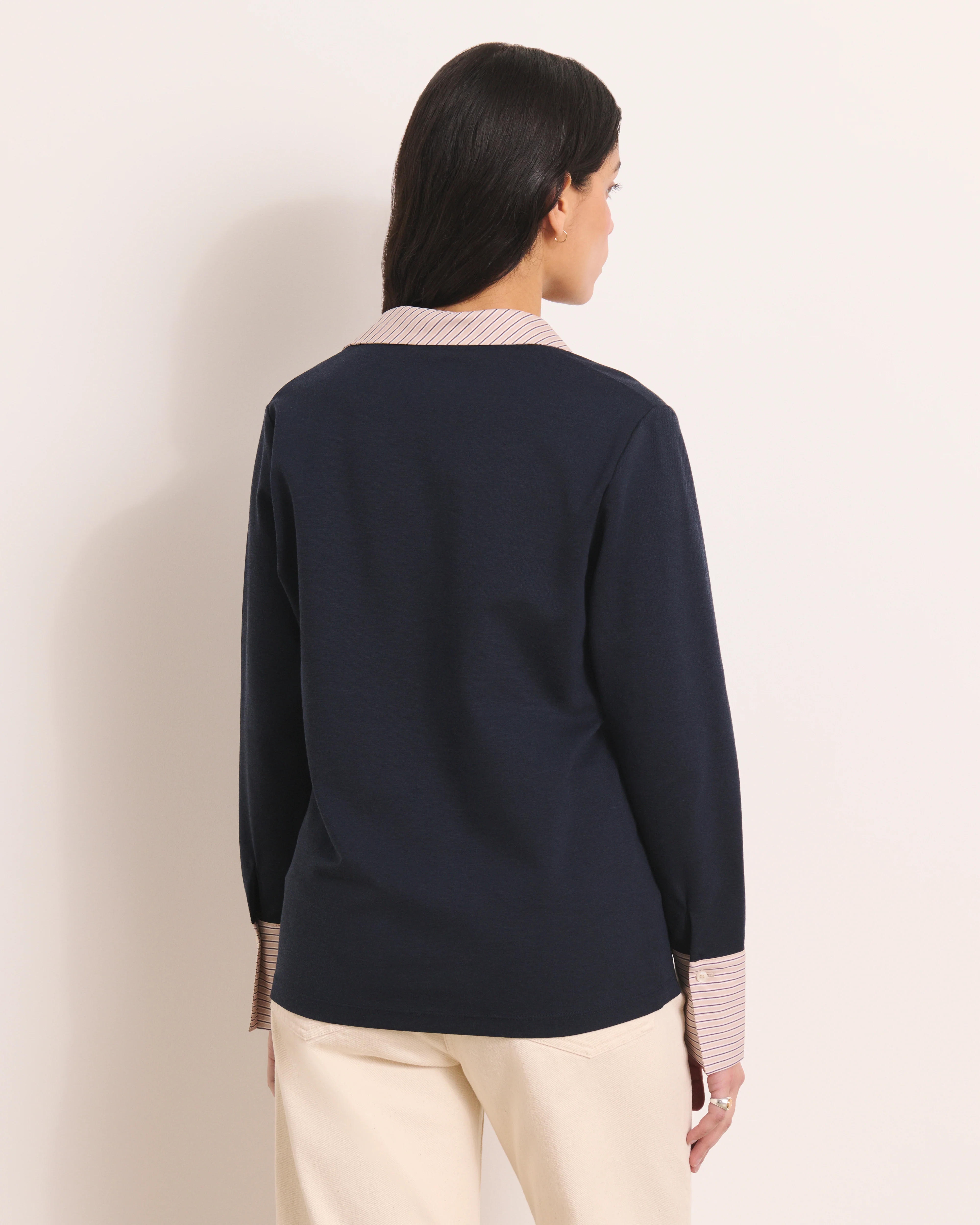 • Col et patte de boutonnage à rayures
