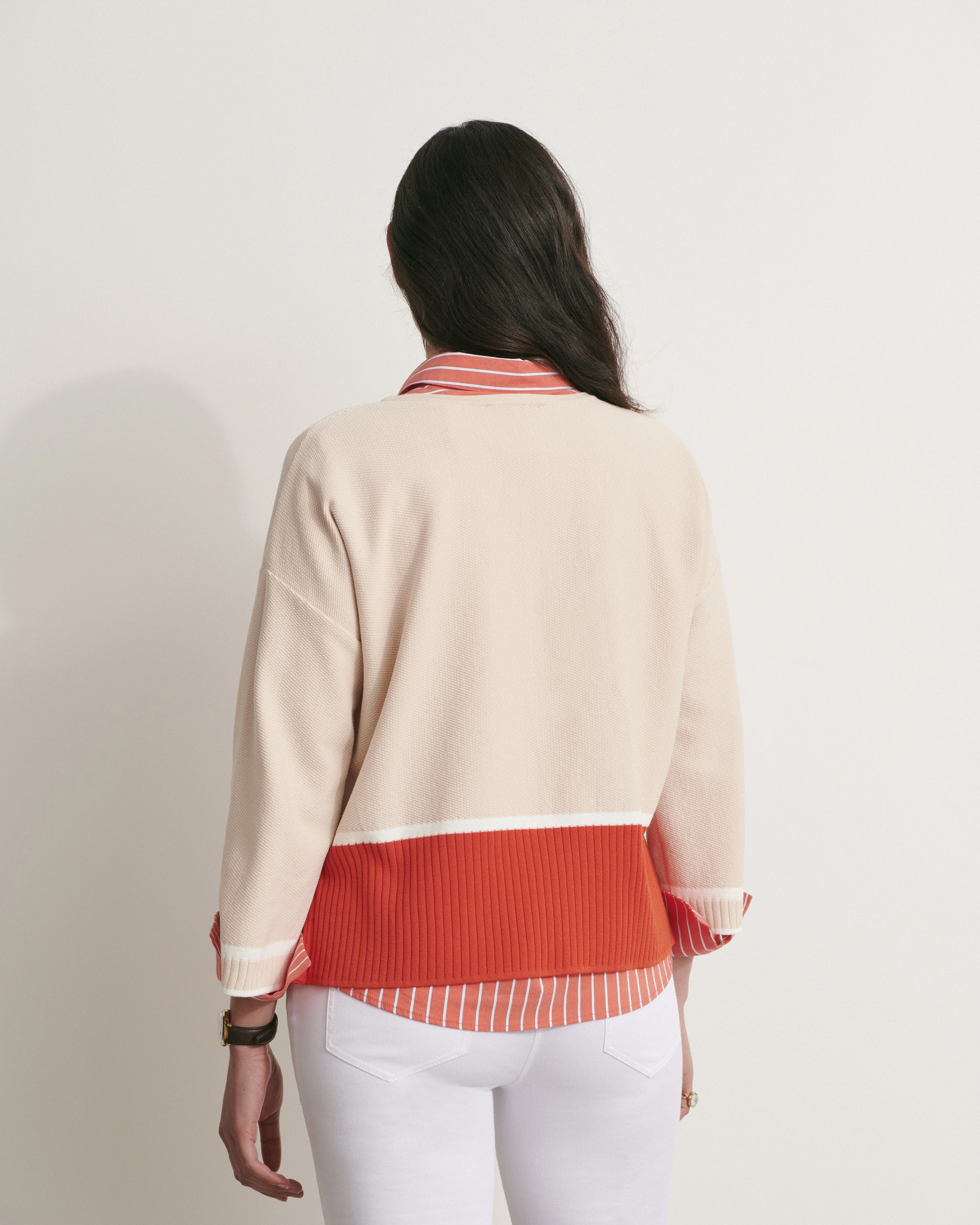 Notre pull boîte iconique en maille revient cette saison dans un colorblock, parfait pour toutes les femmes en quête de confort et de style. Tricoté en France dans nos ateliers historiques de Roanne, il témoigne d'un savoir-faire français exceptionnel. Sa maille piquée stretch offre une sensation agréable sur la peau, tandis que sa palette raffinée de beige, blanc et rouge coquelicot apporte une touche de fraîcheur à votre vestiaire.