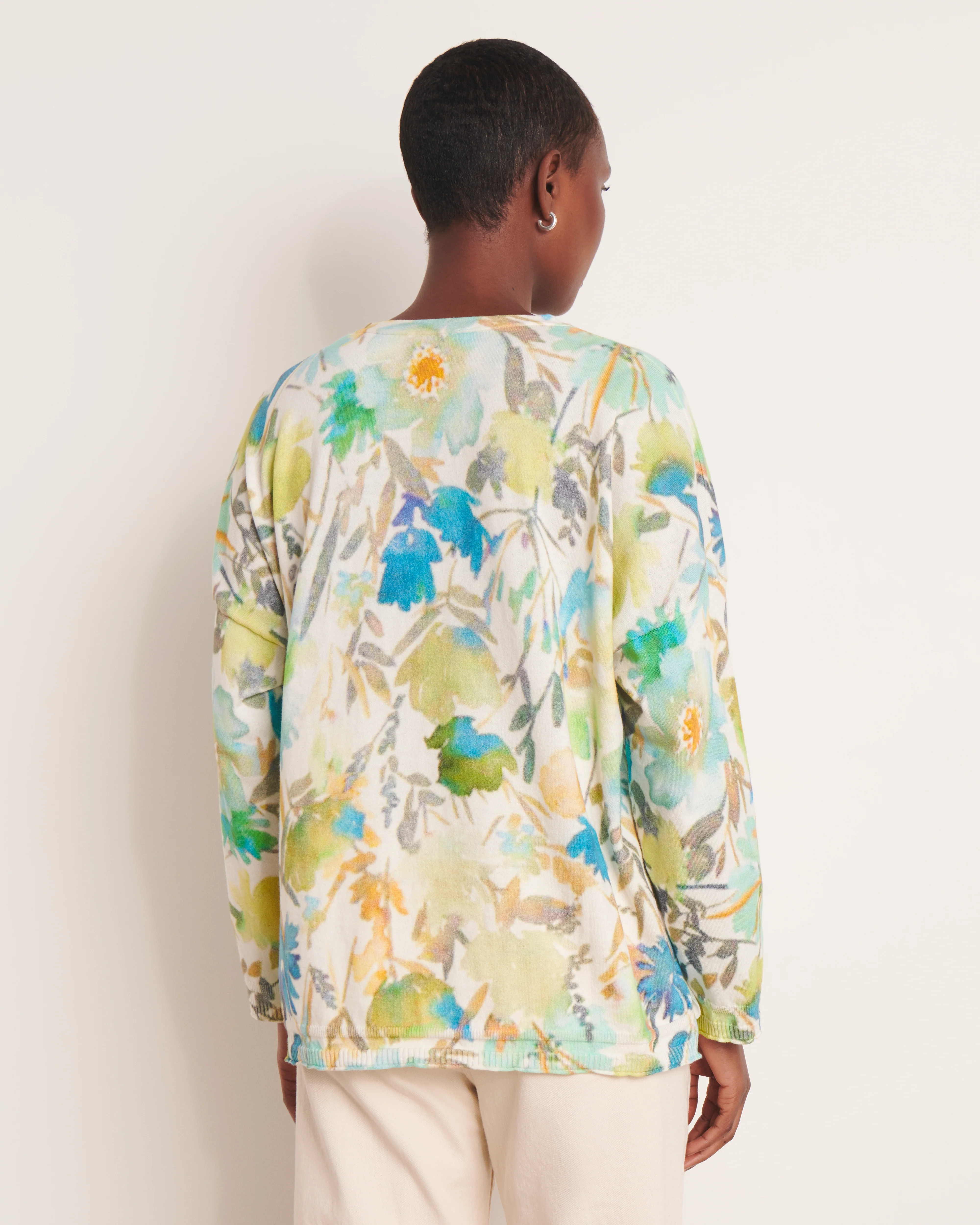 Ce pull allie la douceur du coton et du cachemire à la modernité d’un motif floral délicat.