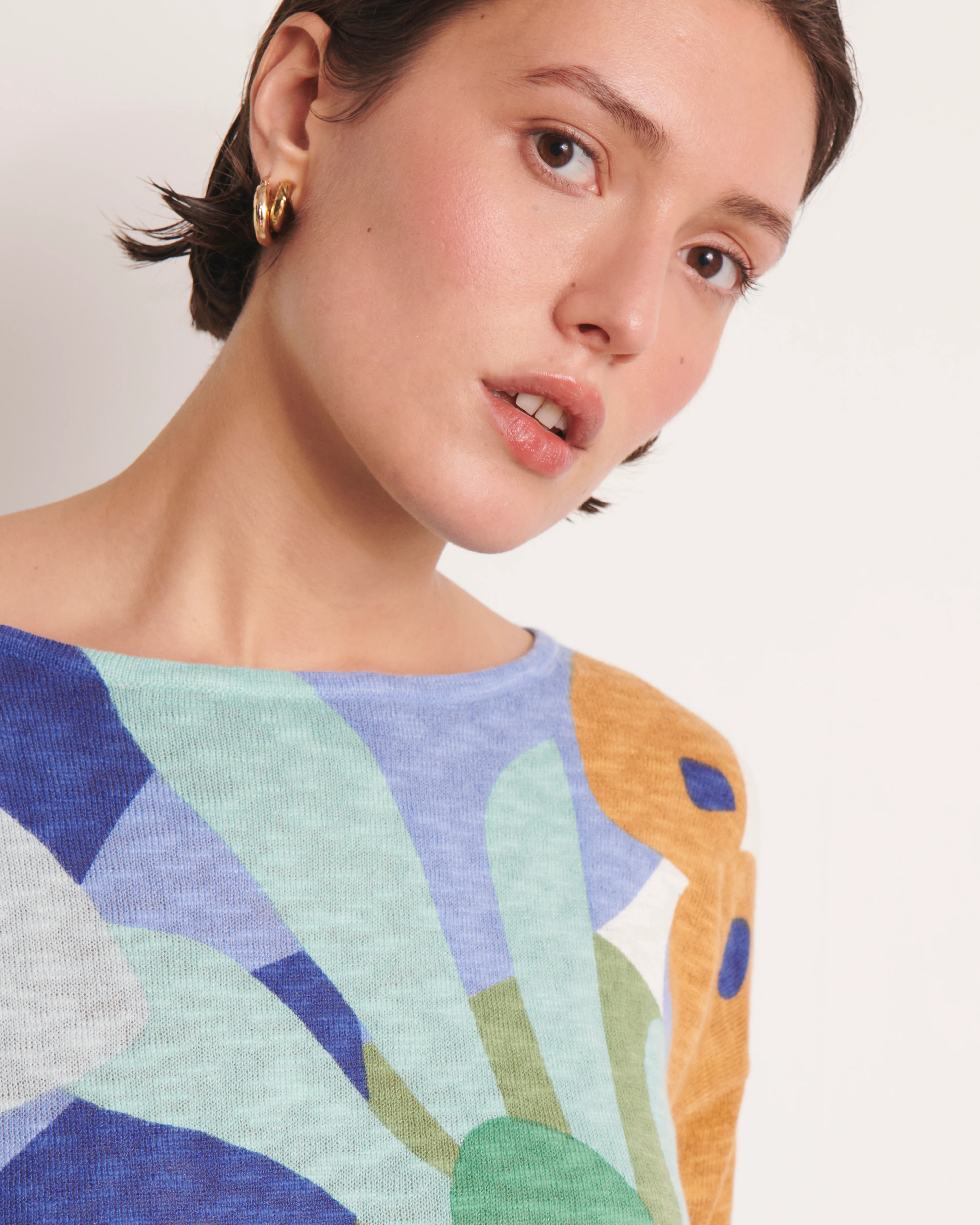L’encolure bateau dévoile délicatement le port de tête, tandis que les manches 3/4 insufflent une allure féminine et décontractée.