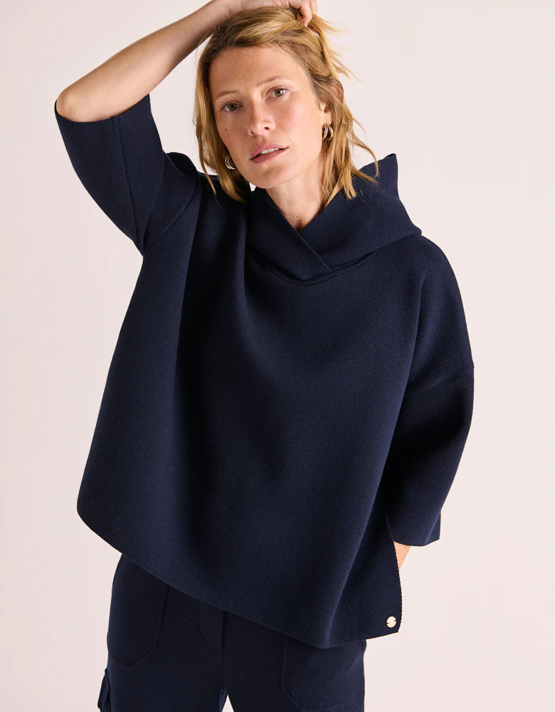Tricoté dans une laine mérinos douce et thermorégulatrice, ce sweat arbore une coupe ample et des manches 3/4 larges qui offrent une silhouette décontractée, tandis que les fentes latérales apportent une touche de sophistication discrète. La capuche généreuse et les manches raglan soulignent l'esprit casual de cette pièce, parfaite pour un style effortless chic. Chaque détail, du choix du fil à la finition soignée, témoigne d'un travail minutieux de la maille.