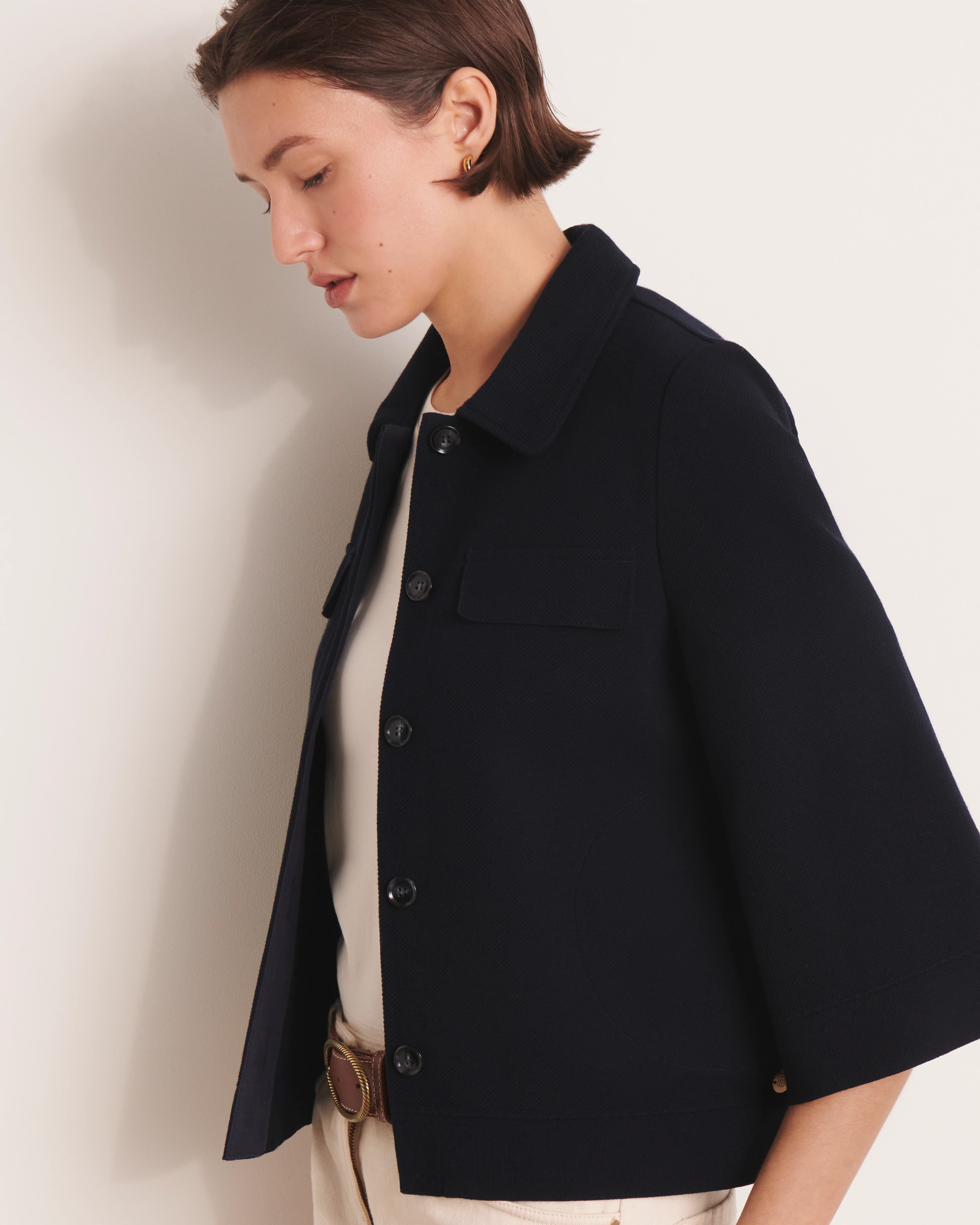 Cette veste boutonnée en maille se distingue par une coupe droite et élégante. Son col classique apporte une touche intemporelle, tandis que les manches montées larges, à la longueur 3/4, offrent une silhouette légère et sophistiquée. Les deux poches poitrines avec rabats combinent praticité et raffinement. Teintée d’un bleu marine intemporel, cette pièce phare de la collection Devernois est tricotée en France, dans les ateliers historiques de Roanne, gage d’un savoir-faire artisanal et d’une qualité irréprochable.