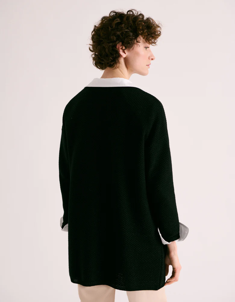Tricotée dans nos ateliers historiques en France, cette veste incarne l'élégance intemporelle. Son encolure ronde et ses épaules légèrement tombantes lui confèrent une allure décontractée et féminine. Rehaussée de deux poches plaquées pour un côté pratique, sa coupe épurée n'en reste pas moins sophistiquée.